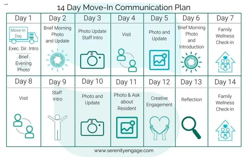This Communication Overview Plan outlines a Day by Day guide to maintaining clear communication between staff and family during the first two weeks your loved one enters a community. It has common myths and answers, areas for notes and is beautifully put together.